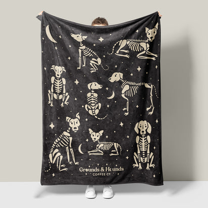 Our new Skelly Pup Blanket features our "skelly pups" printed on an ultra soft human size blanket!