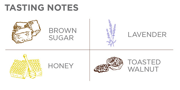 Distinct notes of toasted walnut and brown sugar explode from the cup, followed by delicate notes of lavender, honey crisp apple, and caramel on the finish.