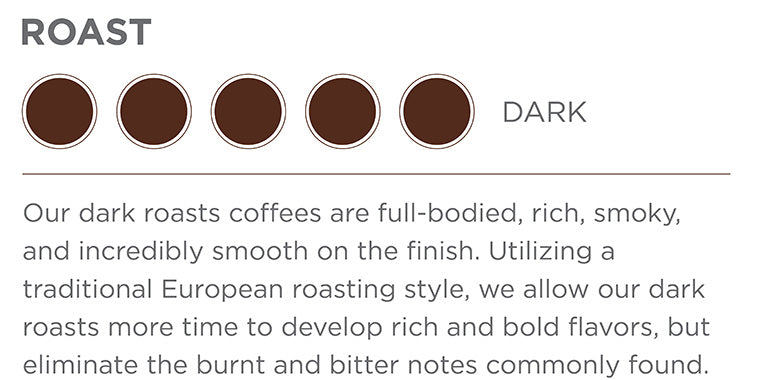 We believe that a great dark roast starts with the quality of beans you choose to roast. To provide dark roast lovers with a special treat, we are releasing a limited batch of specialty grade, 100% organic, 100% Fair Trade volcanic soil grown Sumatran coffee, roasted to dark and oily perfection. Bold, rich, smoky, and smooth, you'll love every sip of our exclusive Single Origin dark roast coffee.